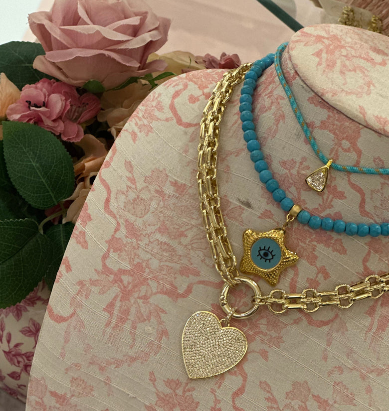 Channel powerful protection and timeless style with the Starry Eye Necklace. Handcrafted with radiant turquoise beads, this piece features a gold-framed evil eye pendant—an ancient symbol believed to ward off negativity and attract positive energy. With its adjustable gold chain and striking design, this necklace is perfect for everyday wear or as a statement piece layered with your favourite chains.